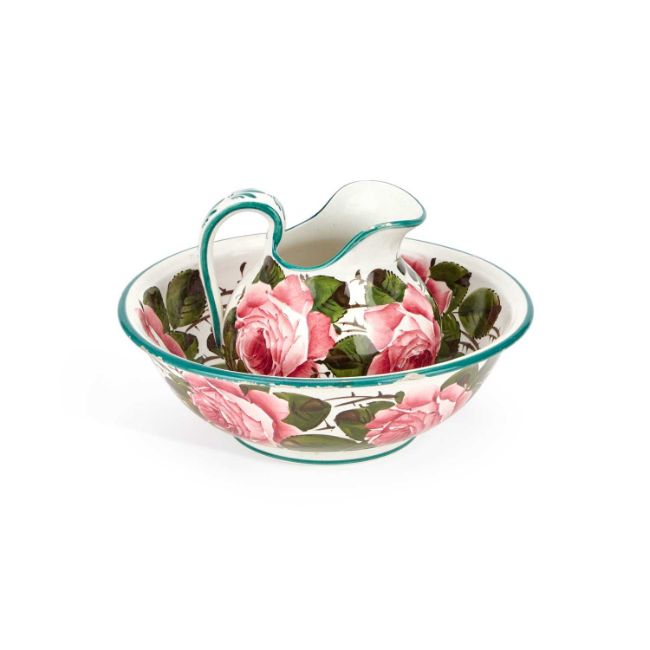 each decorated with cabbage roses, the bowl with mark for Robert Heron & Sons. (2) Bowl 29cm diameter