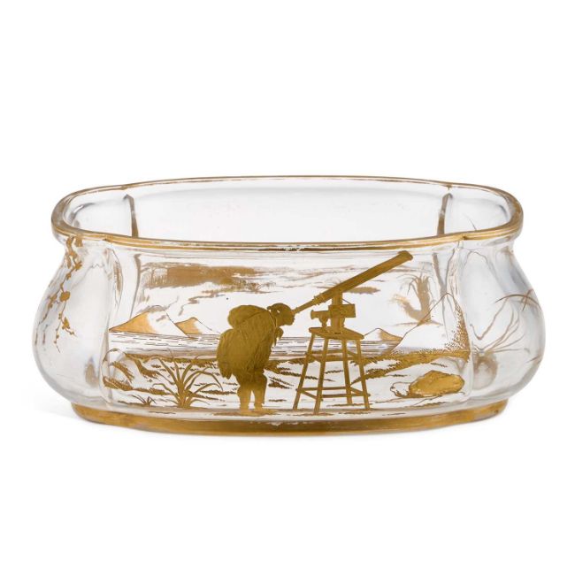 the exterior is decorated in gilt with Japonisme landscapes, including a scene of a man peering into a telescope, the sides with bulrush and cherry tree motifs, the rim and foot rim gilded. 12.5cm high, 31cm long