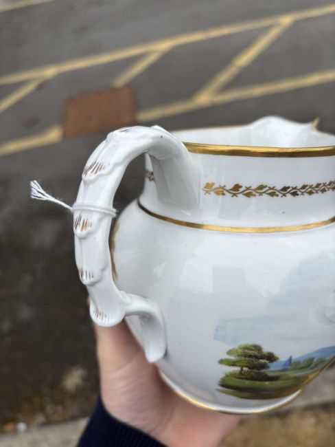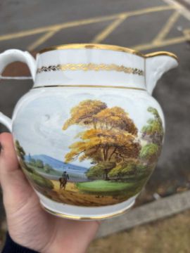 painted to either side with a landscape, gilded initials in a laurel wreath to the front, gilt borders. 14cm high