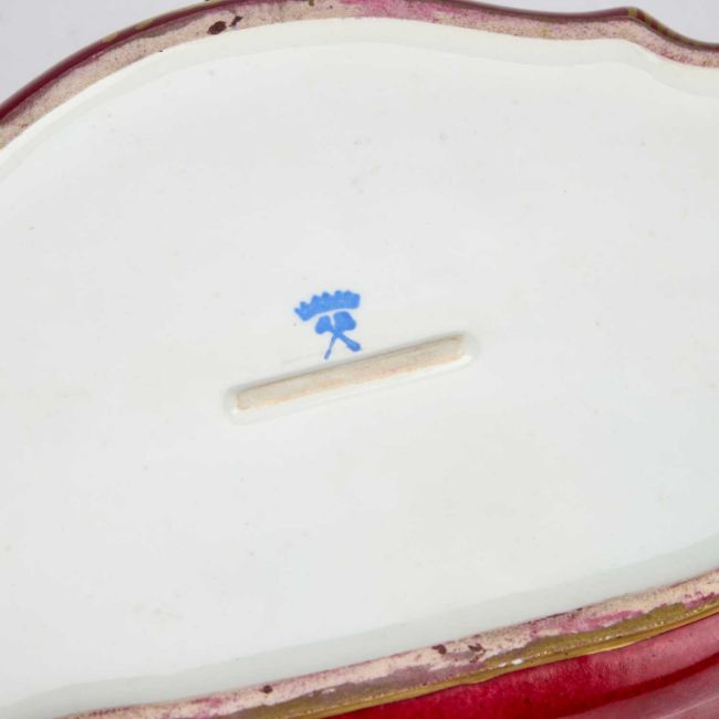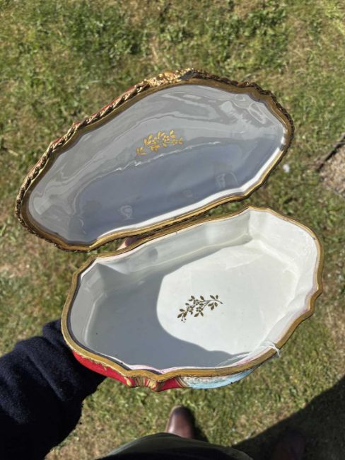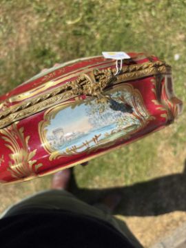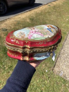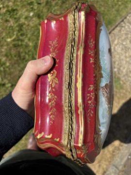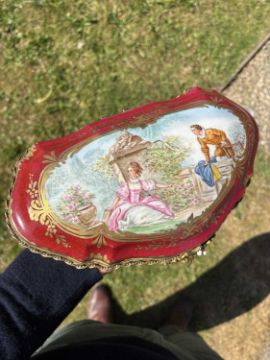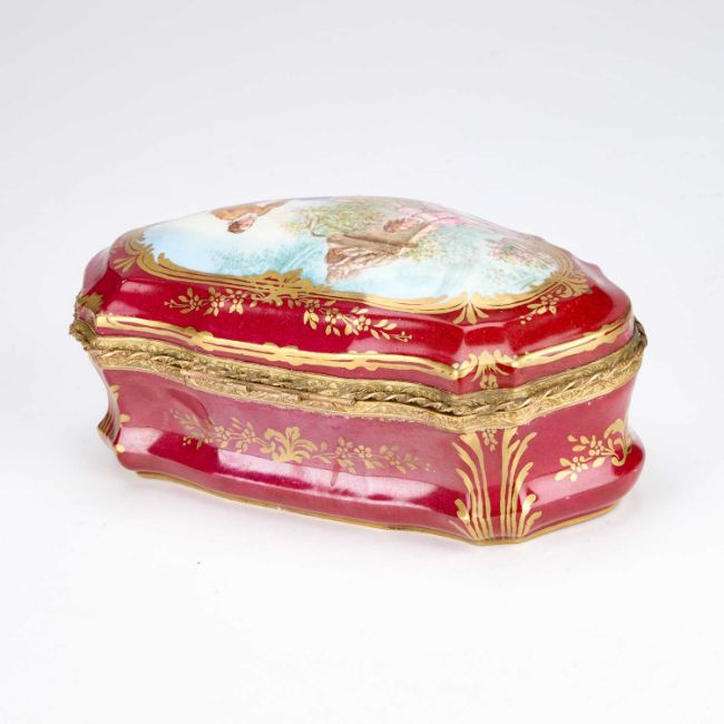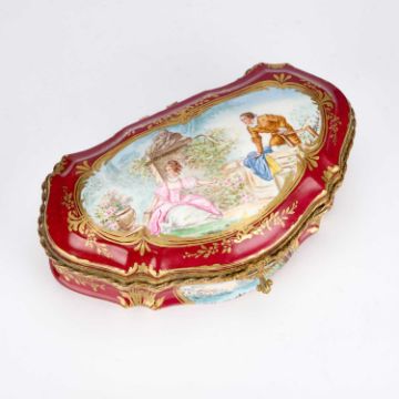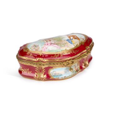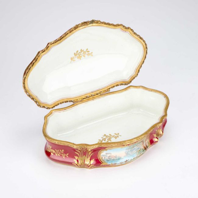 cartouche-shaped, the hinged cover painted with an 18th Century courting couple in a garden, the front with a river landscape, embellished with gilding on a rouge ground. 27.5cm long