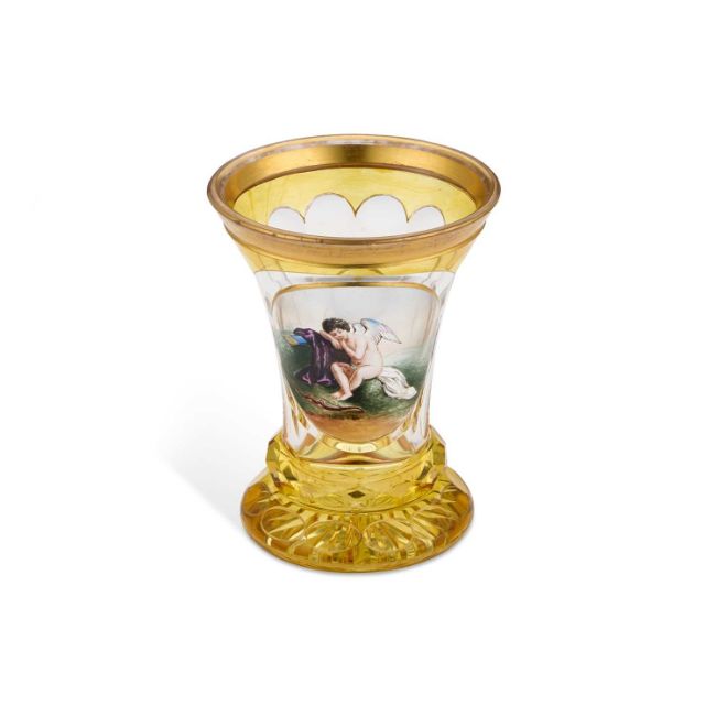 of flaring circular form, the fluted bowl enamelled with the figure of cupid in a raised roundel, above an amber base with slice-cut ovals. 13.5cm high