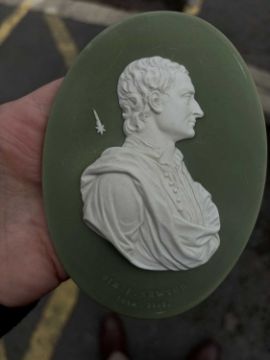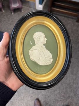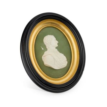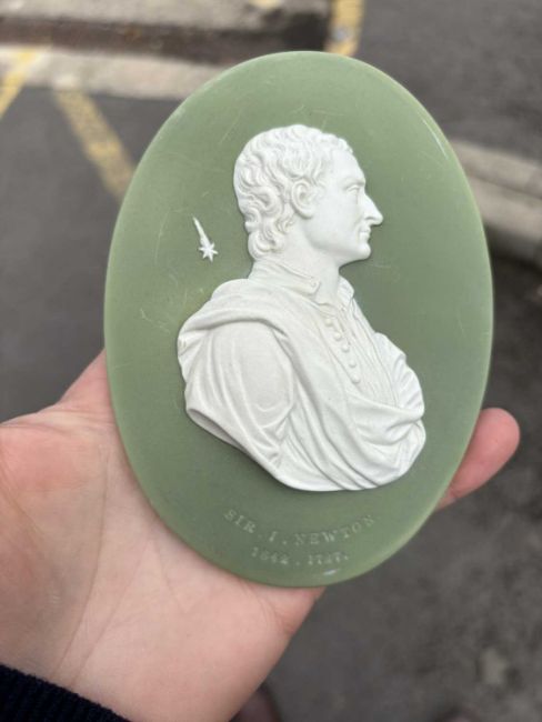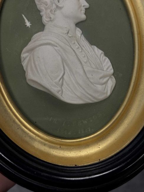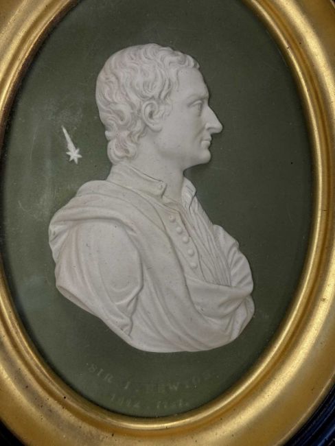 in high relief, with uppercase WEDGWOOD mark and titled SIR I. NEWTON 1642 . 1727, framed. 20cm by 15.5cm overall