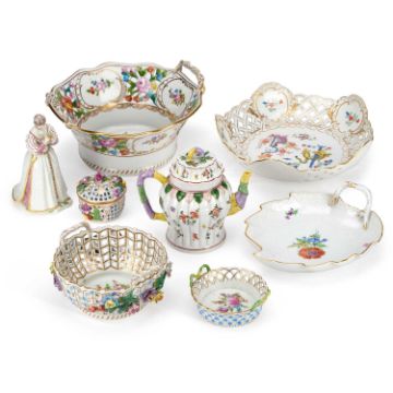 including a Meissen figure of Florinetta, no. 64584, a Dresden teapot, a Meissen leaf-shaped dish, etc. (8) Figure 15cm high