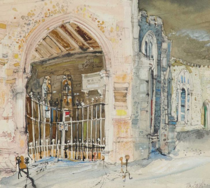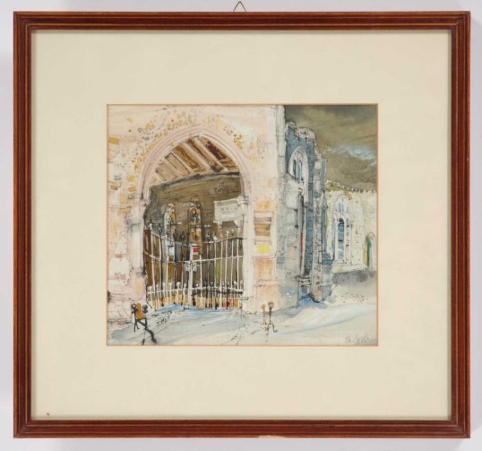 TOM GAMBLE (1924-2020) ST NEOTS, GOTHIC ARCHWAY ‡ SignedWatercolour and pencil 21cm x 23.5cm