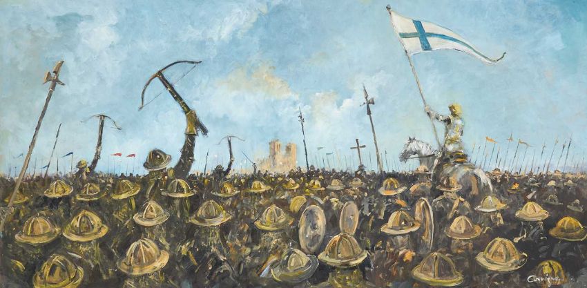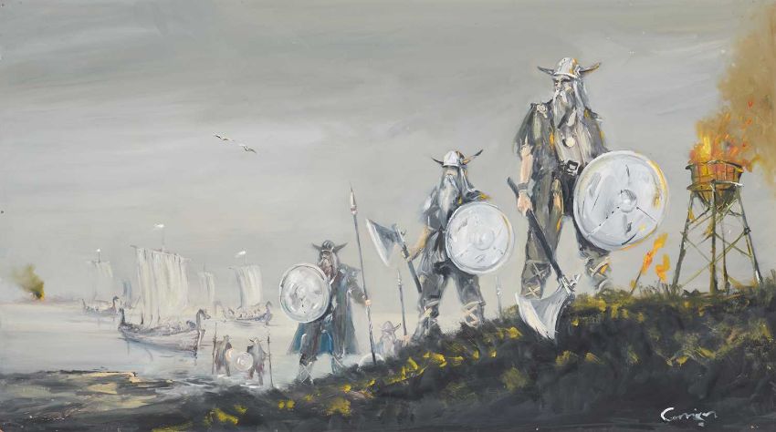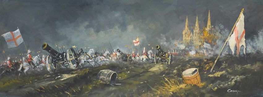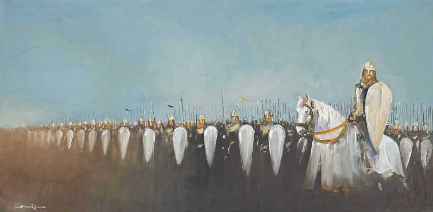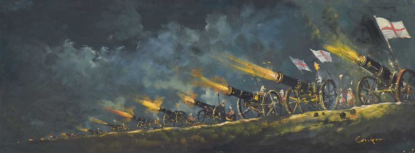 CAVAN CORRIGAN (20TH CENTURY) SIX LARGE BATTLE SCENES ‡ All signedOil on boardUnframed Largest 61cm x 122cm Qty: 6