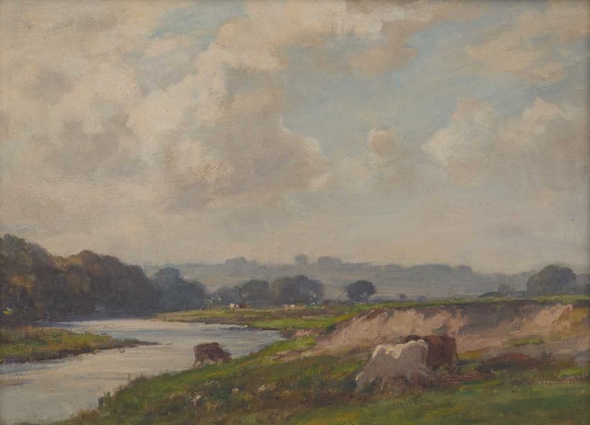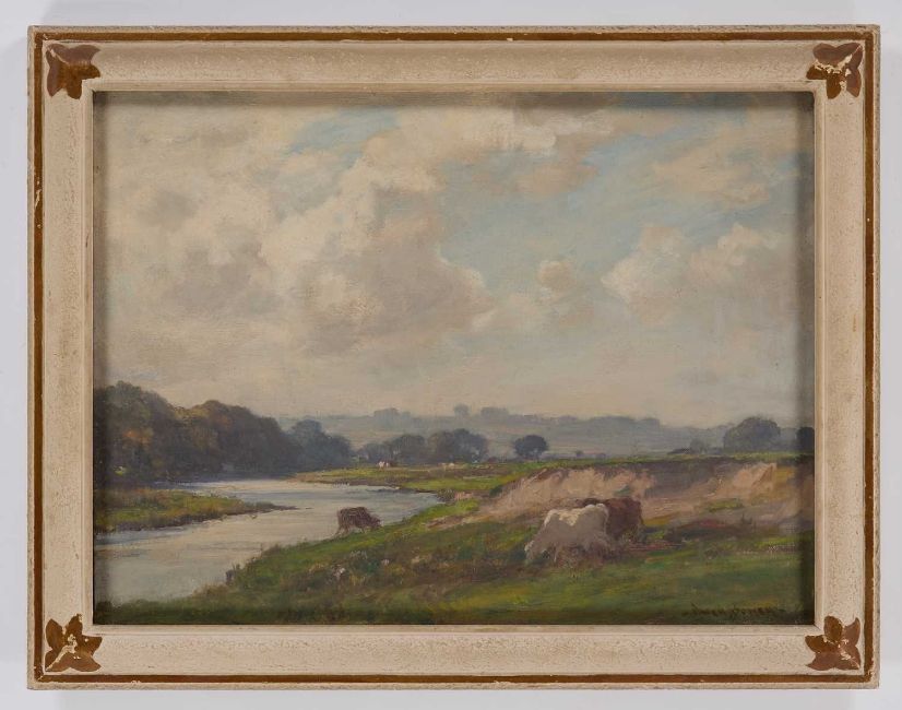 OWEN BOWEN (1873-1967) RIVER LANDSCAPE WITH CATTLE GRAZING ‡ SignedOriginal letter versoOil on canvas 44cm x 60cm