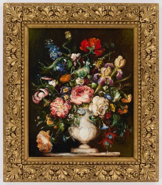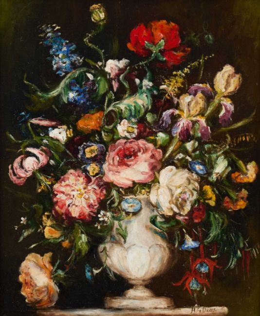 H.G DAVIS (20TH CENTURY) STILL LIFE OF FLOWERS IN A URN SignedOil on canvas 54.5cm x 44.5cm