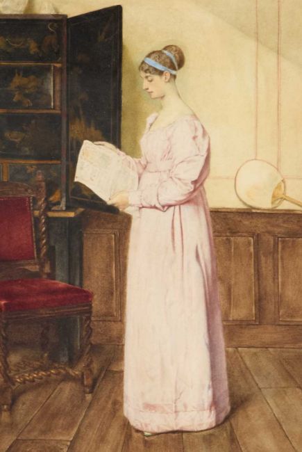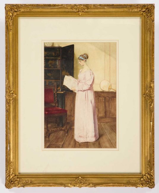 ATTRIBUTED TO CHARLES GREEN (1840-1898) LADY READING A PAPER IN AN ELEGANT INTERIOR No visible signatureWatercolour 32cm x 21.5cm