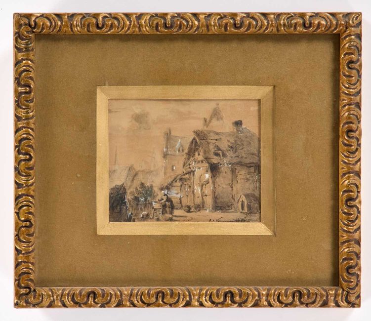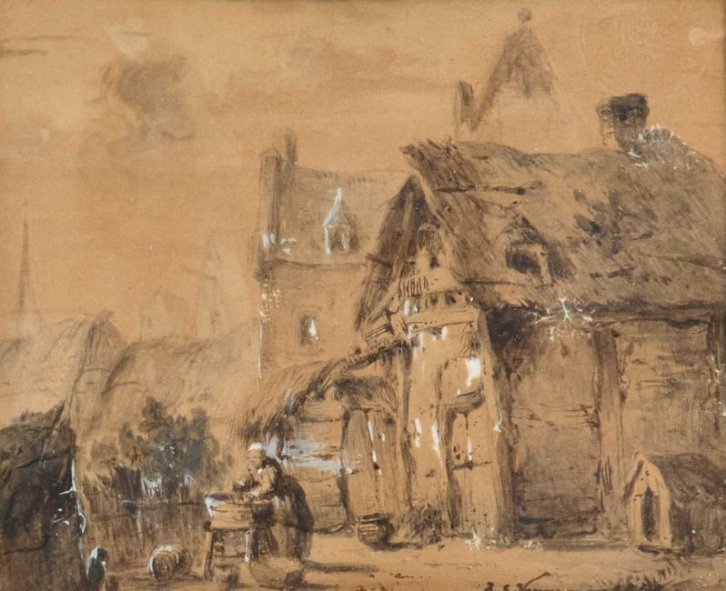 19TH CENTURY DUTCH SCHOOL FIGURE OUTSIDE A HOUSE Indistinctly signed and dated 1847Collection stamp on paperInk, pencil and wash 9cm x 11.5cm