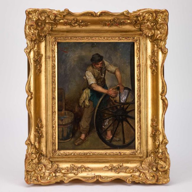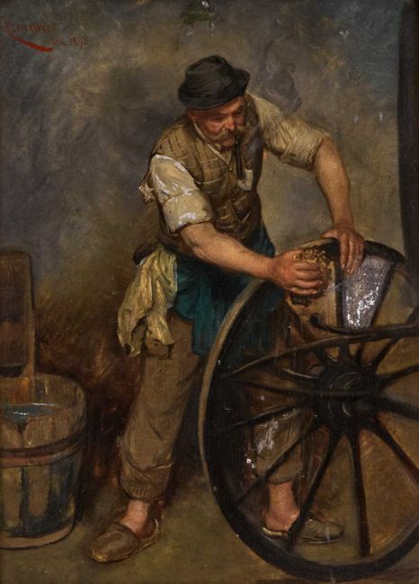 ERNEST S. KLEMPNER (AUSTRIAN/AMERICAN 1867-1941) THE WHEELRIGHT Signed and dated 'Wien 1893'Oil on panel 30cm x 22cm