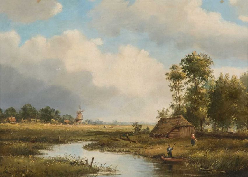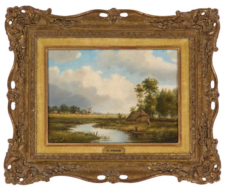 H VROOM (DUTCH 19TH CENTURY) LANDSCAPE WITH RIVER AND WINDMILL SignedOil on panelProvenance: With MacConnal-Mason & Son, St James's, London (label verso) 16.5cm x 23cm