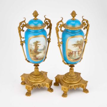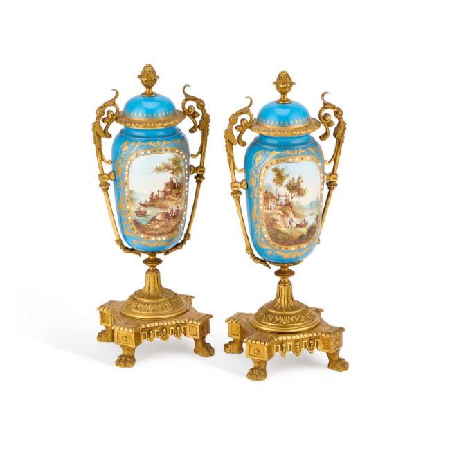 each with a fixed domed cover and twin handles terminating in leaf scrolls, painted front and back with rustic river landscapes. (2) 27cm high