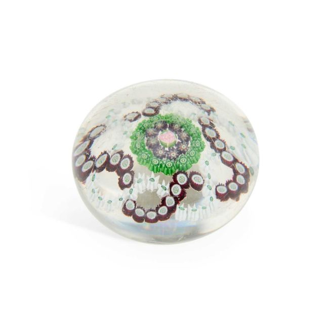 with two inter-linked quatrefoils in red, white and green enclosing a central green pastry-mould cane. 7.5cm diameter