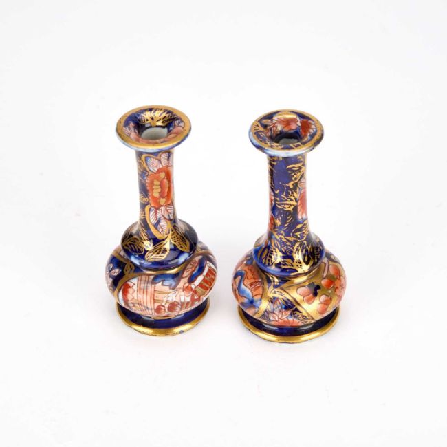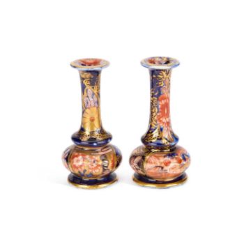 each squat globular body issuing a cylindrical neck with an everted rim, decorated with a Japan pattern in an Imari palette. (2) 9cm high