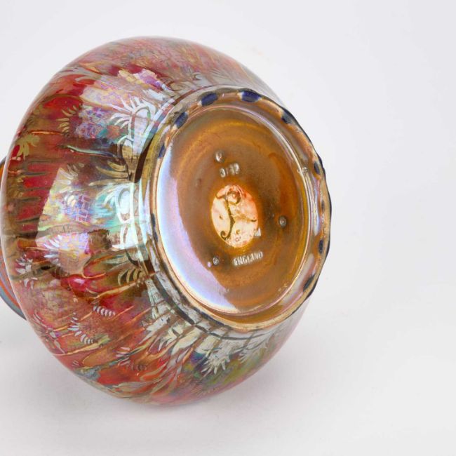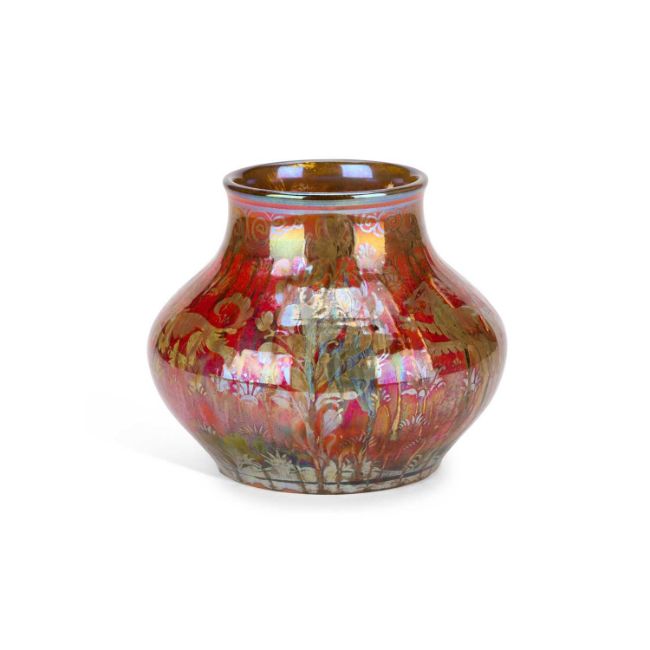 of squat circular form, painted with beasts and trees on a red ground, impressed factory mark, painted artist’s monogram. 15cm high