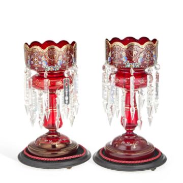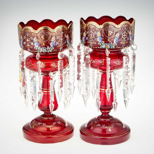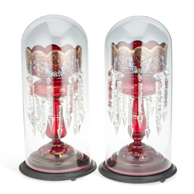 each typically hung with prismatic drops and with gilt highlights, under glass domes. (2) Slight height difference, 36cm high (approx.)