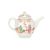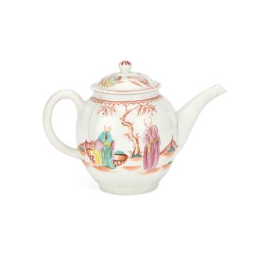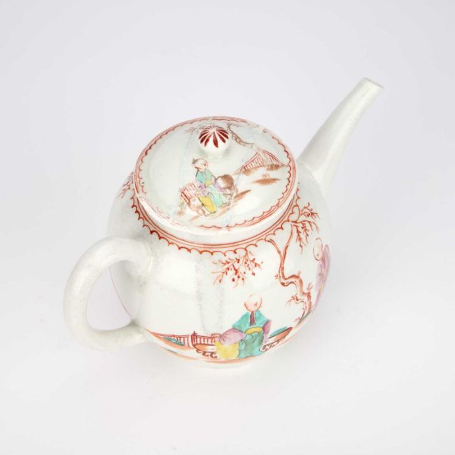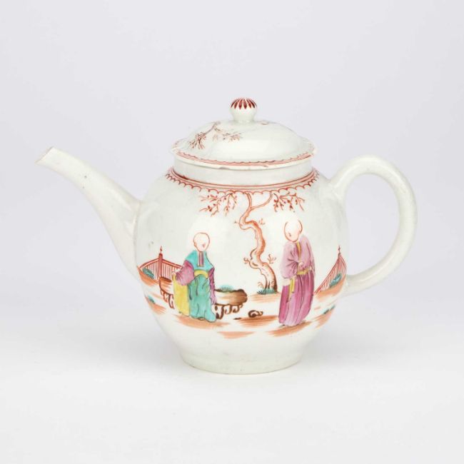 of globular form with a mushroom finial and a gently curved spout, painted in Mandarin style with two figures within a fenced garden, a similar scene to the reverse. 15cm high