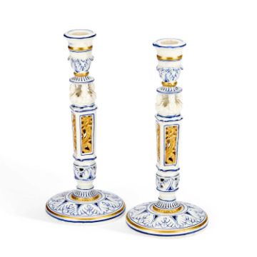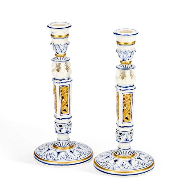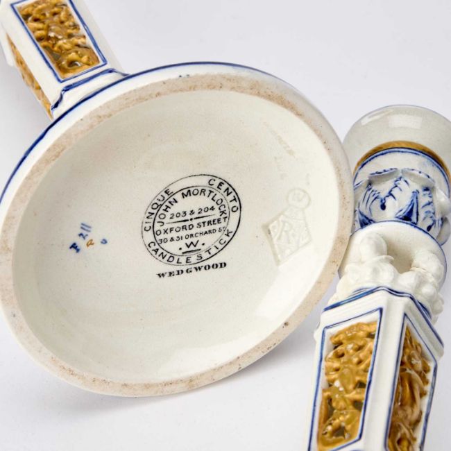 of Renaissance Revival style, each with a floral-form sconce supported by four female busts above a squared section pierced with reticulated and gilded panels depicting figures and torchères, raised on circular pedestal feet moulded with acanthus leaves, decorated in underglaze cobalt blue and heightened with gilt, impressed and printed Wedgwood factory marks, impressed diamond registration mark for 14 November 1876, and retailer's mark for John Mortlock, London. (2) 27cm high