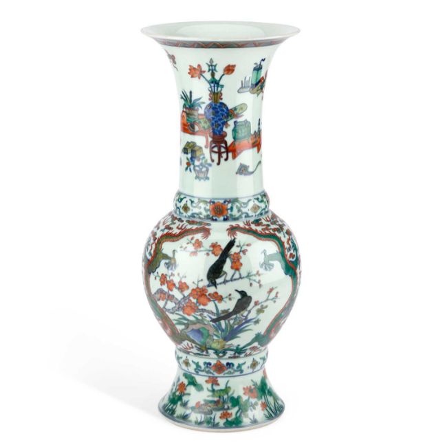 enamelled with dragons pursuing flaming pearls amidst flowering branches, cranes and auspicious emblems, the tall flared neck painted with scholarly objects and ribboned precious vessels, bearing an underglaze blue six-character mark. 45cm high