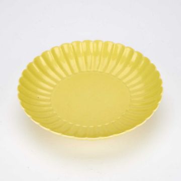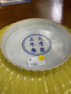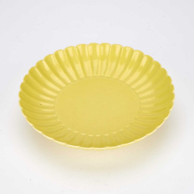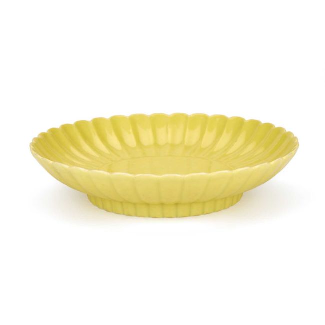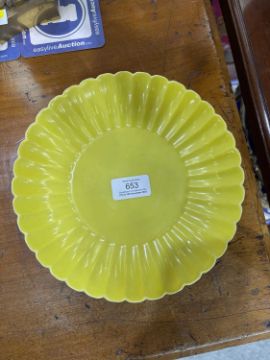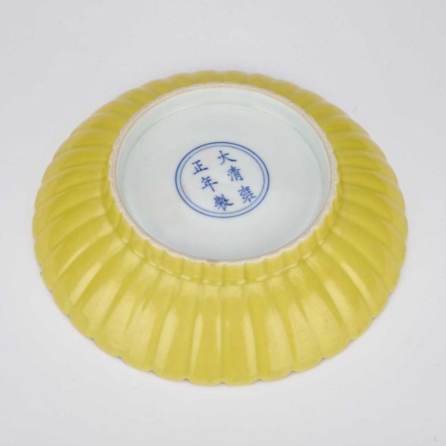 the shallow body moulded with radiating petals beneath a rich egg-yolk yellow glaze, the underside bearing a six-character mark within double circles in underglaze blue. 20.5cm diameter