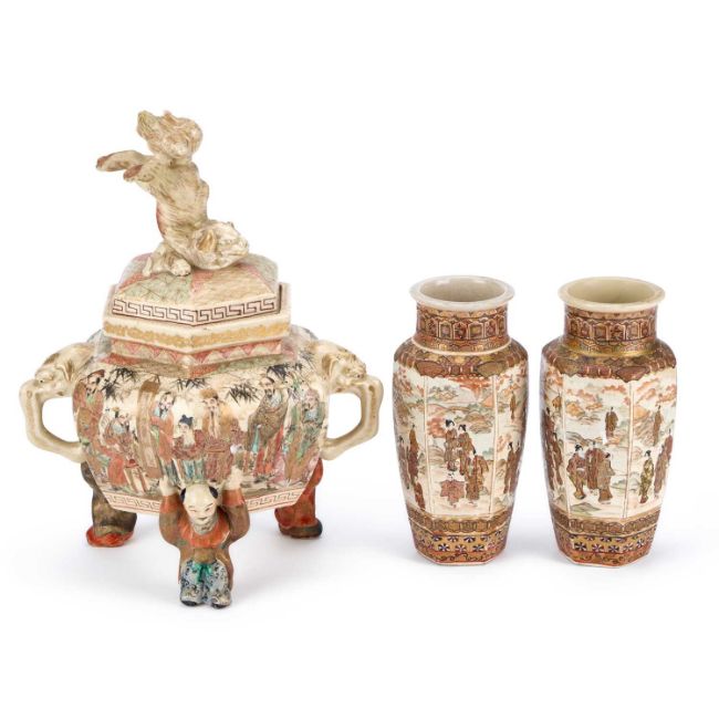 early 20th Century, of hexagonal form with figural tripod feet; together with a pair of Japanese Satsuma vases. (3) Koro 30.5cm high