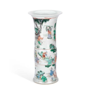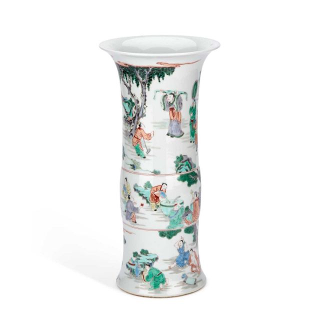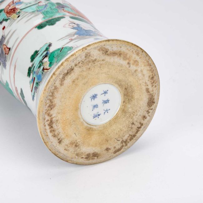the archaistic beaker form painted in three register scenes with scholars, attendants, and sages in landscape settings, bearing an underglaze blue six-character mark. 42cm high