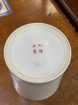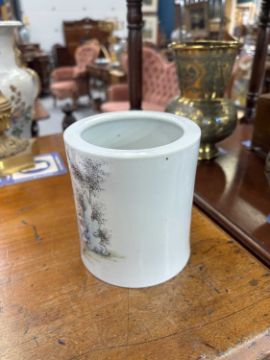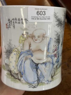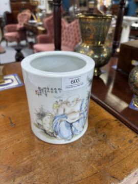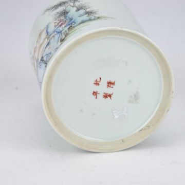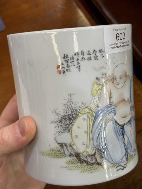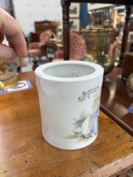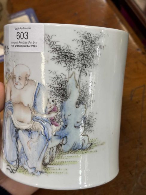of cylindrical form, enamel painted with Buddha and children, inscribed, bears an iron-red four-character mark. 12.5cm high