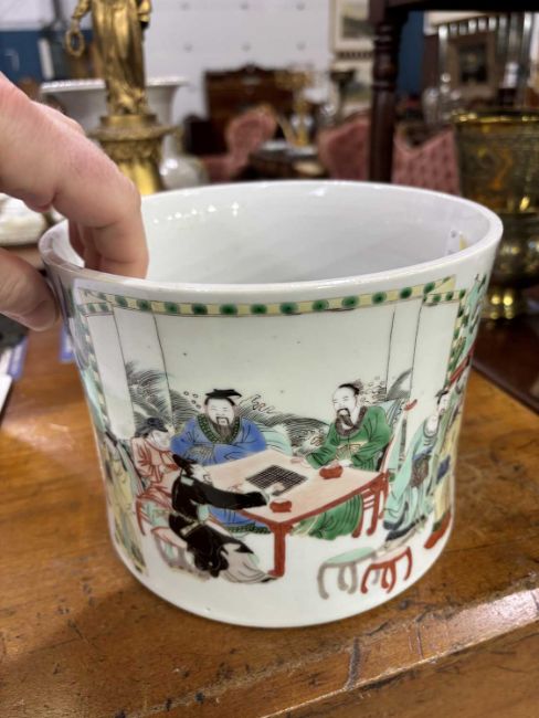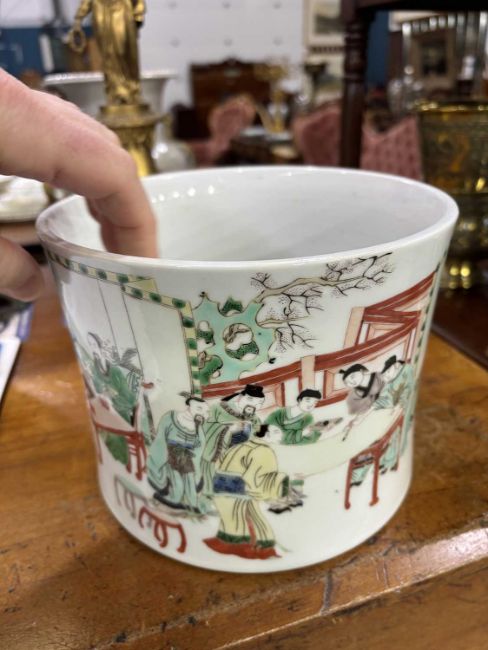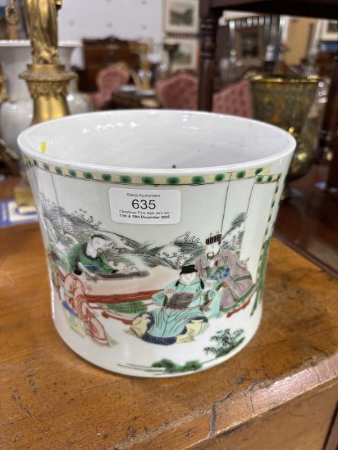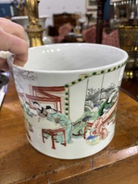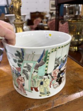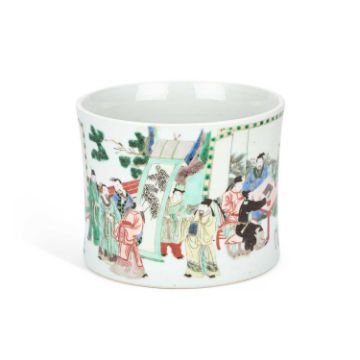of slightly waisted form, finely enamelled with courtly figures engaged in scholarly pursuits within terraced and garden settings. 15cm high