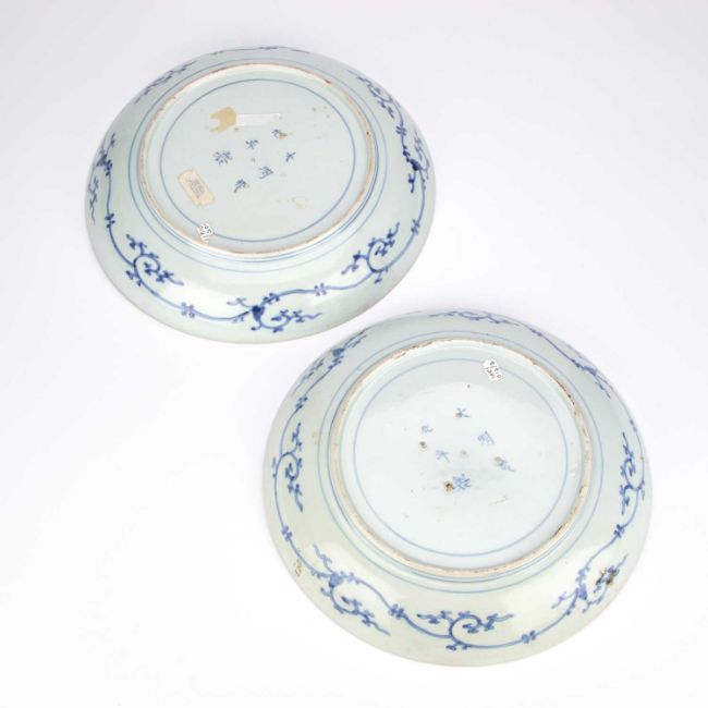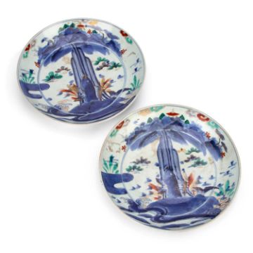 each boldly painted in underglaze blue with overglaze enamels depicting a dramatic waterfall cascading between pine-studded rocks, with cloud scrolls and scattered foliage around the rim, the reverse with a simple blue border and six-character marks. (2) 30cm diameter