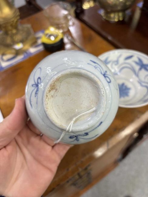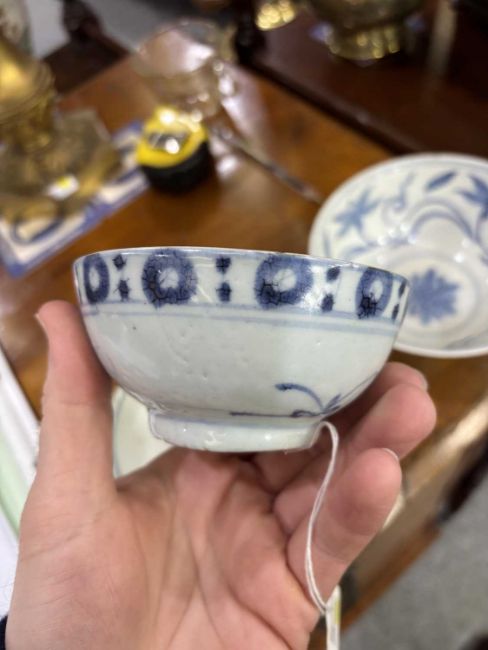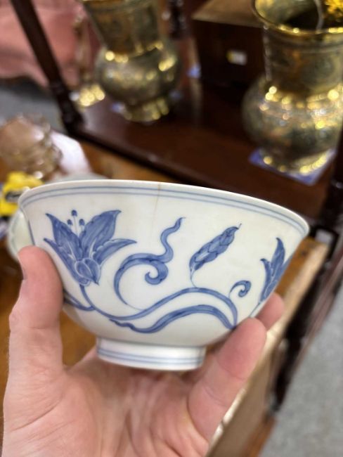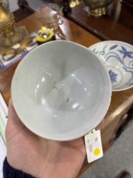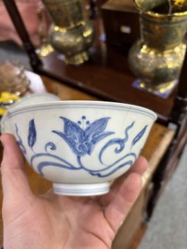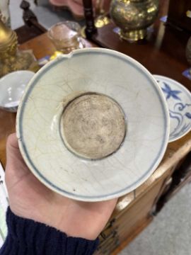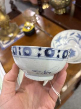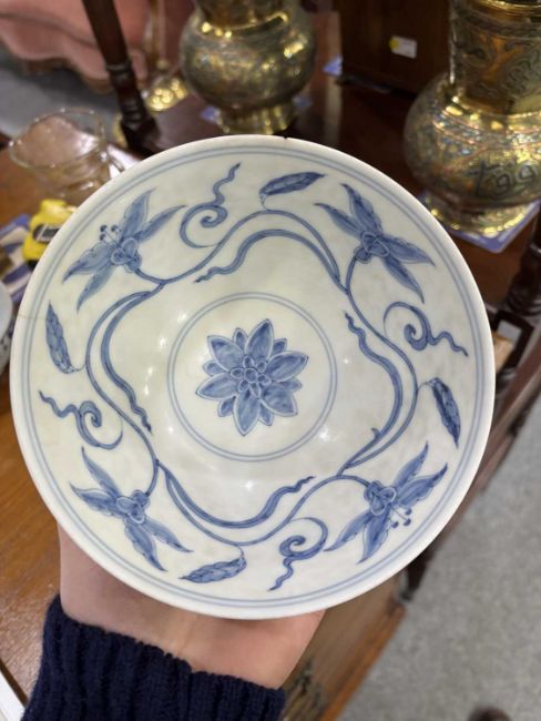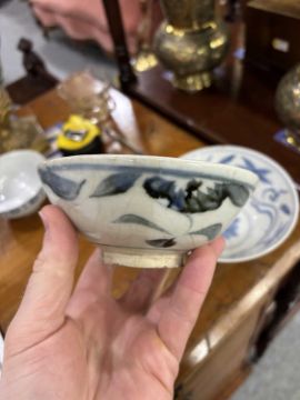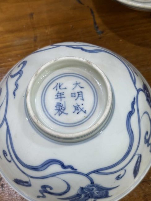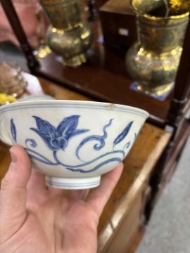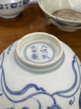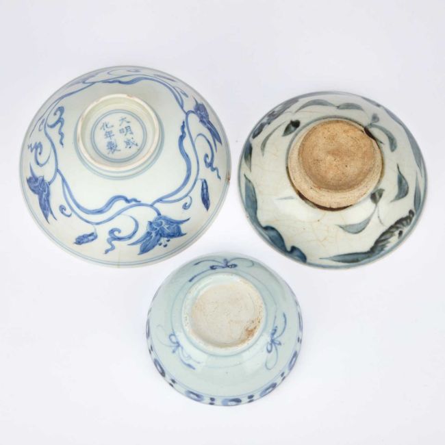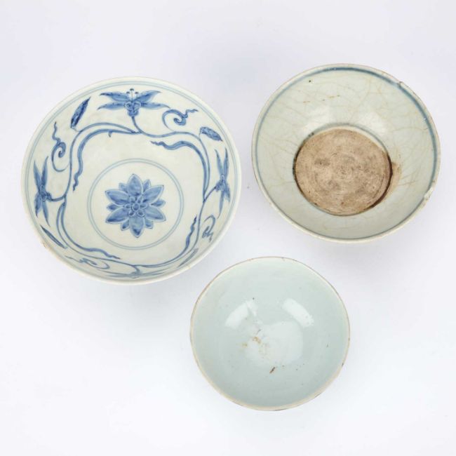 comprising a larger bowl painted with scrolling lotus, another with floral sprays and a smaller bowl with a band of circular motifs. (3) Largest 15cm diameter