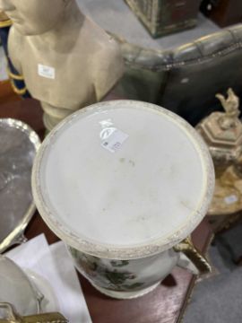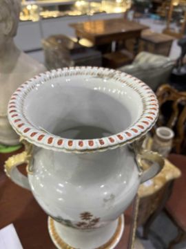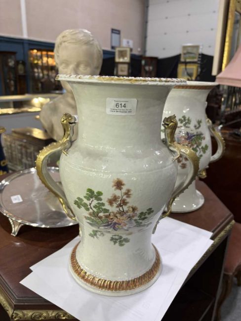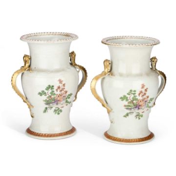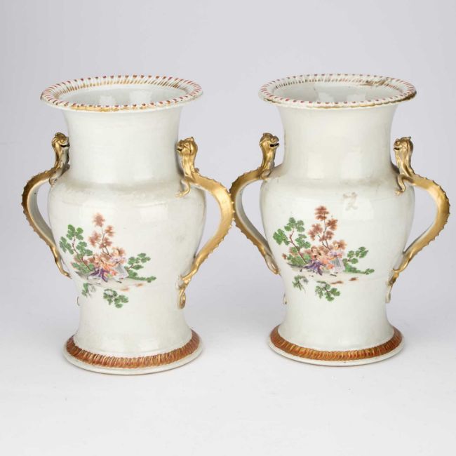 of baluster form with gilt moulded zoomorphic handles, each finely enamelled in the Famille Rose palette with a scene of figures in a wooded landscape, the flared rims and circular bases with moulded and gilt scalloped borders. (2) 32cm high