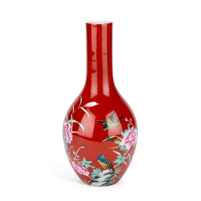 the coral-red ground enamelled with birds among peony blossom, reverse with calligraphic inscription and seal marks, bearing a four-character mark to the base. 21cm high