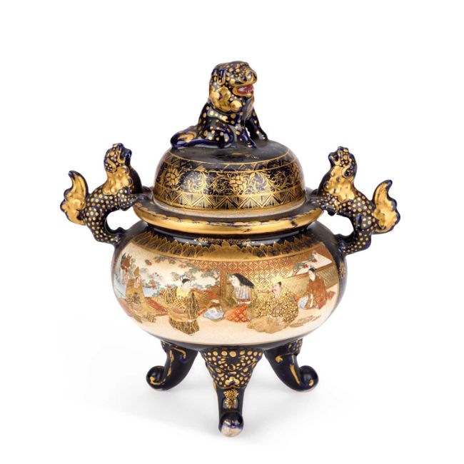 the cobalt and gilt ground painted with panels of aristocrats and attendants in landscape settings, applied with shi-shi handles and surmounted by a shi-shi finial, signed. 23cm high